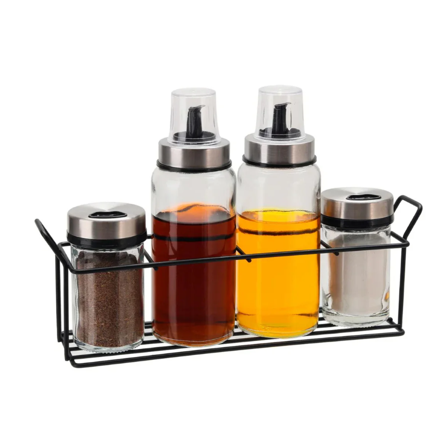 Este set Alcuza Classic incluye dos botellas de vidrio transparente de alta calidad, cada una con capacidad de 250 cc, ideales para aceite y vinagre. Además, cuenta con dos especieros de 110 cc con tapa metálica dosificadora, perfectos para mantener tus condimentos organizados y accesibles. La repisa incluida facilita su almacenamiento y uso, sumando una capacidad total de 720 cc. Su diseño funcional y materiales duraderos garantizan precisión y comodidad en la cocina.