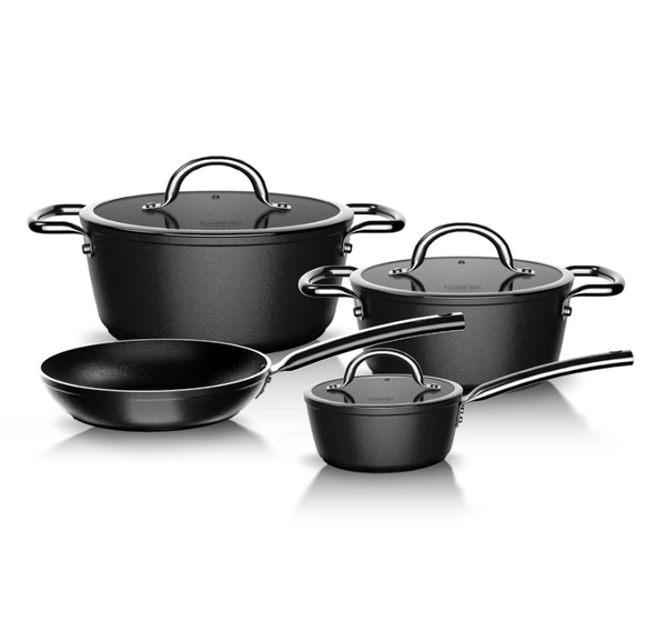 Eleva tu cocina con la batería Wens Black de 7 piezas, fabricada en aluminio forjado de 4 mm para una distribución de calor uniforme y eficiente.