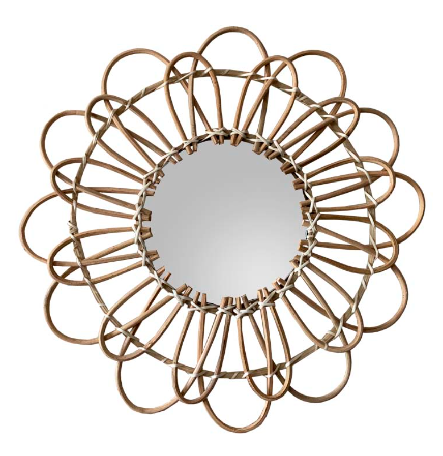 Este espejo artesanal Dalia de mimbre, con un diseño en forma de flor y un diámetro de 44 cm, aporta un toque natural y elegante a cualquier espacio. Su fabricación en mimbre garantiza ligereza y resistencia, ideal para decorar paredes con estilo orgánico y cálido. Perfecto para crear ambientes acogedores y llenos de personalidad.