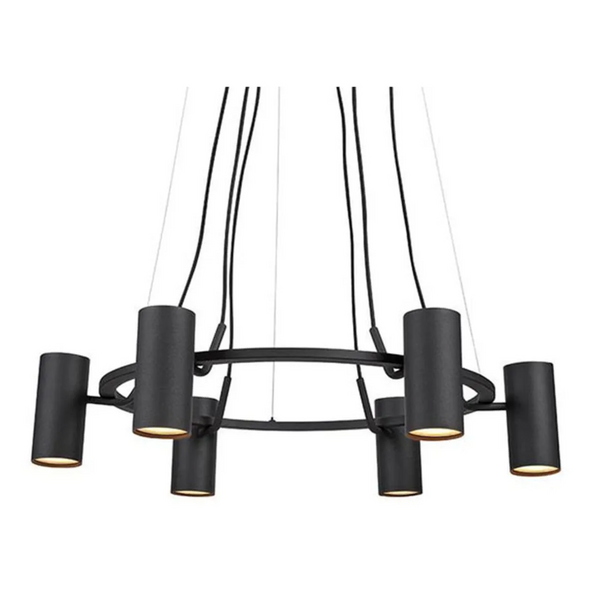 Lámpara de colgar Markslojd Porto en color negro, diseñada para seis bombillas GU10 con potencia máxima de 6W cada una. Su estructura mide 550 mm de largo, 160 mm de ancho y cuenta con un diámetro total de 82 cm, ideal para iluminar espacios con estilo moderno. Funciona a 220V y frecuencia de 50/60Hz, cumpliendo con protección IP20 para ambientes interiores. Perfecta para crear una atmósfera cálida y funcional en cualquier estancia.