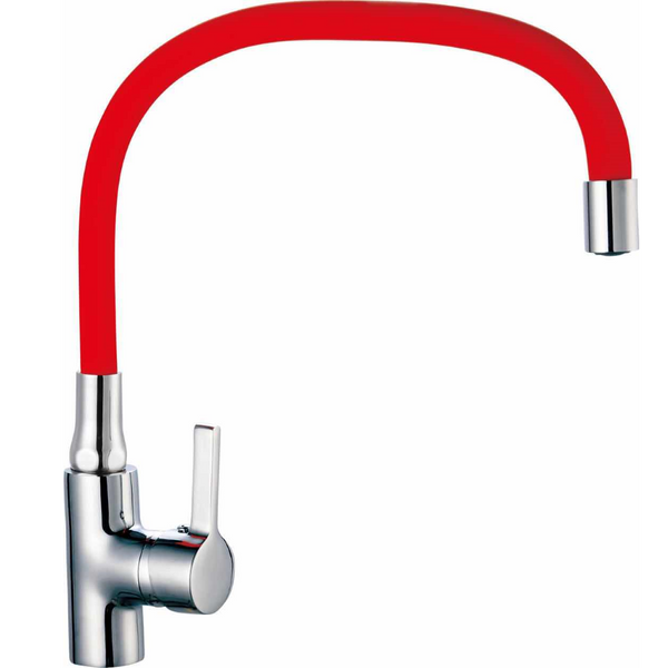 Monomando para lavaplato de Taumm, con cuello flexible y acabado en color rojo vibrante. Este diseño moderno y versátil aporta un toque de color y personalidad a tu cocina.