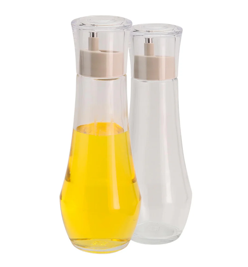 Este set incluye dos botellas de vidrio de 270 cc cada una, diseñadas para aceite y vinagre con forma curvada y ergonómica.