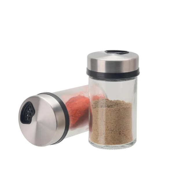 Este especiero de diseño clásico y calidad superior incluye dos frascos de vidrio de 110 cc cada uno, ideales para almacenar y conservar especias con frescura.